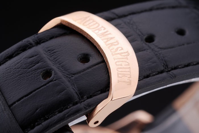 Bracelet: Black crocodile leather strap with heat embossed Audemars Piguet name and logo and an Audemars Piguet inscribed 18k rose-gold plated flip-over hook clasp