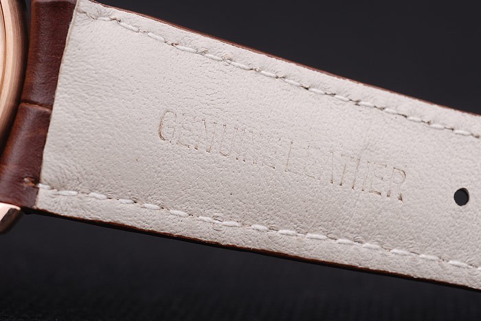 Bracelet: Brown crocodile leather strap with white thread stitching and heat embossed Audemars Piguet name and logo and an Audemars Piguet inscribed 18k rose-gold plated flip-over hook clasp