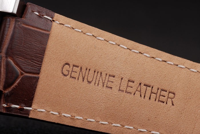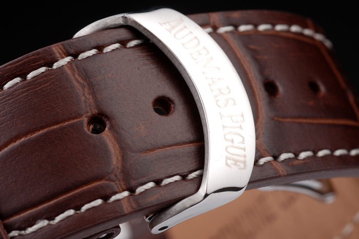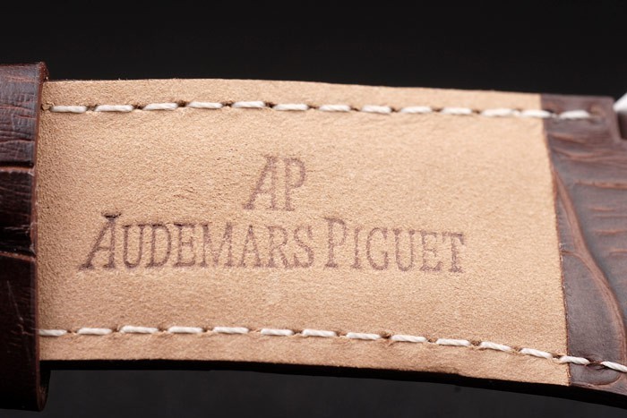 Bracelet: Heat embossed Audemars Piguet brown crocodile leather strap with white stitching and Audemars Piguet engraved stainless steel fold-in clasp