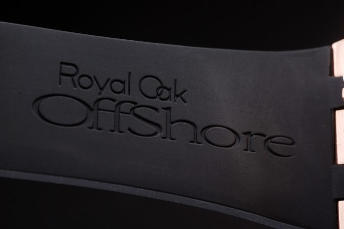 Bracelet: Audemars Piguet Royal Oak Offshore embossed black rubber strap with Audemars Piguet engraved rose-gold fold-in clasp
