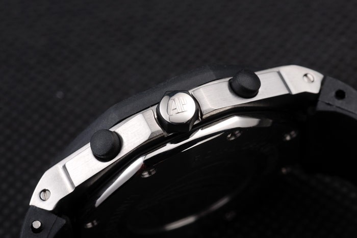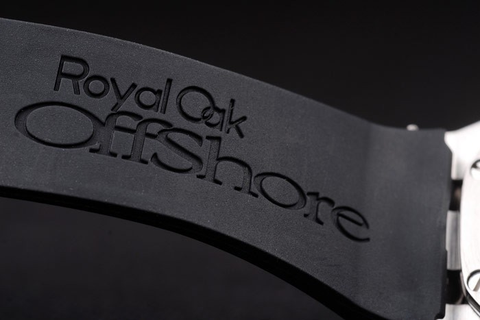 Bracelet: Audemars Piguet Royal Oak Offshore embossed black rubber strap with Audemars Piguet engraved polished stainless steel fold-in clasp