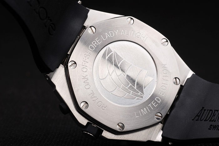 Back: Brushed stainless steel screwed down back with Audemars Piguet logo and engravings