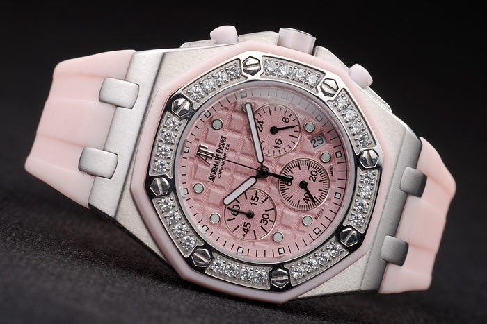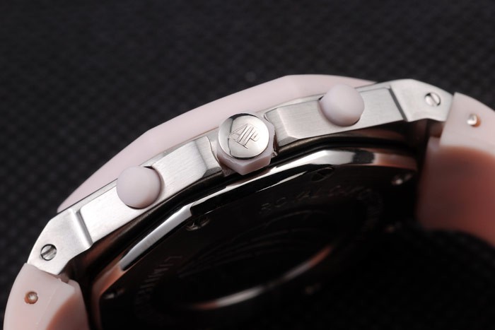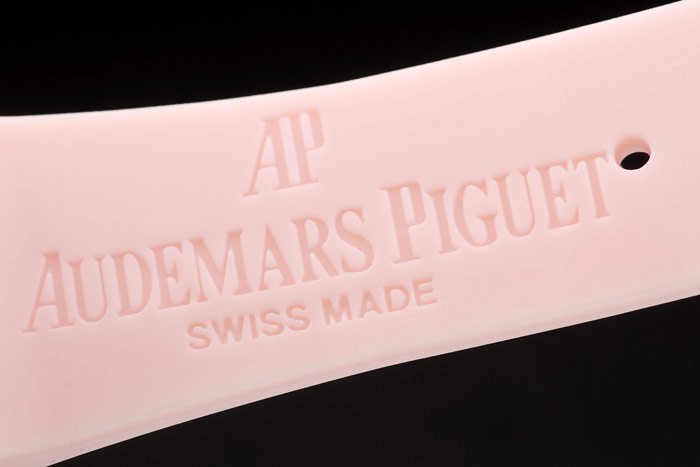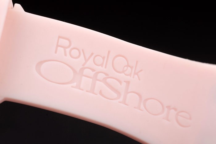 Bracelet: Audemars Piguet Royal Oak Offshore embossed pink rubber strap with Audemars Piguet engraved brushed stainless steel fold-in clasp