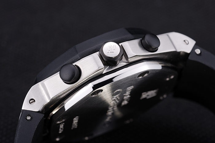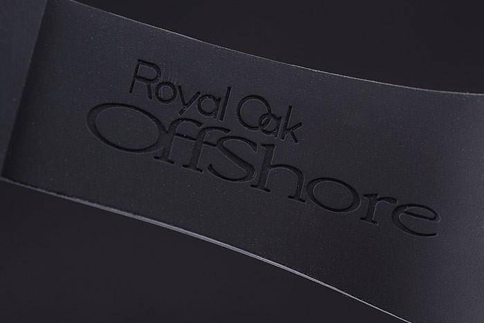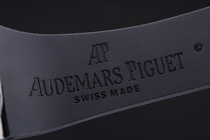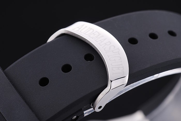 Bracelet: Black rubber strap with heat embossed Audemars Piguet Royal Oak Offshore stamp and an Audemars Piguet inscribed stainless steel flip-over hook clasp