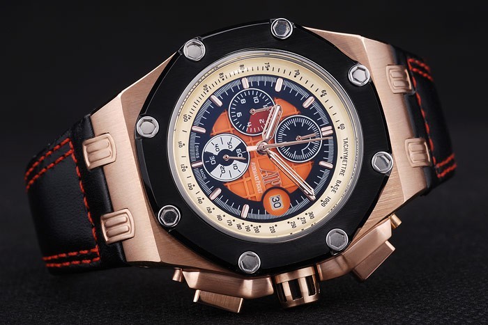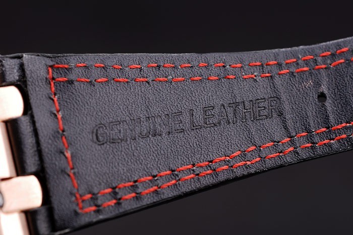 Bracelet: Heat embossed Audemars Piguet Swiss Made and logo black leather strap with double red thread stitching and Audemars Piguet engraved rose-gold plated hook-buckle clasp