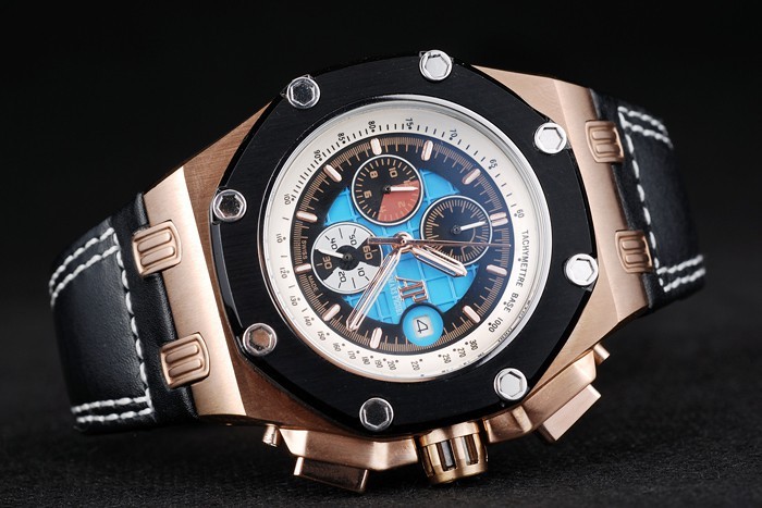 Bracelet: Heat embossed Audemars Piguet Swiss Made and logo black leather strap with double white thread stitching and Audemars Piguet engraved stainless steel hook-buckle clasp