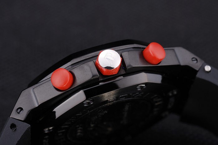 Crown: Stainless steel Audemars Piguet logo engraved red enamel cutwork crown with two smaller crowns on either side of it