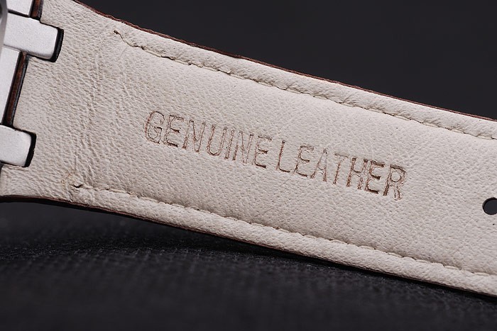 Bracelet: Brown crocodile leather strap with white thread stitching and heat embossed Audemars Piguet name and logo and an Audemars Piguet inscribed stainless steel flip-over hook clasp