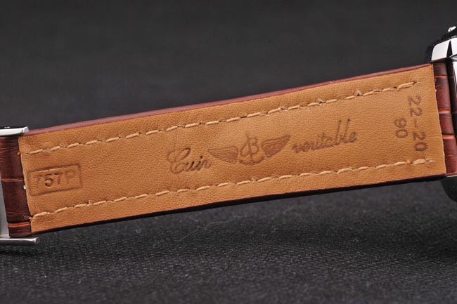 Bracelet: Warm mahogany colored high-grade leather in a crocodile pattern, with heavy white cotton stitching. Tan inner band is embossed with the Breitling name and logo, and has a steel buckle closure.