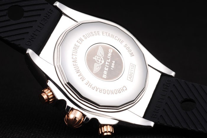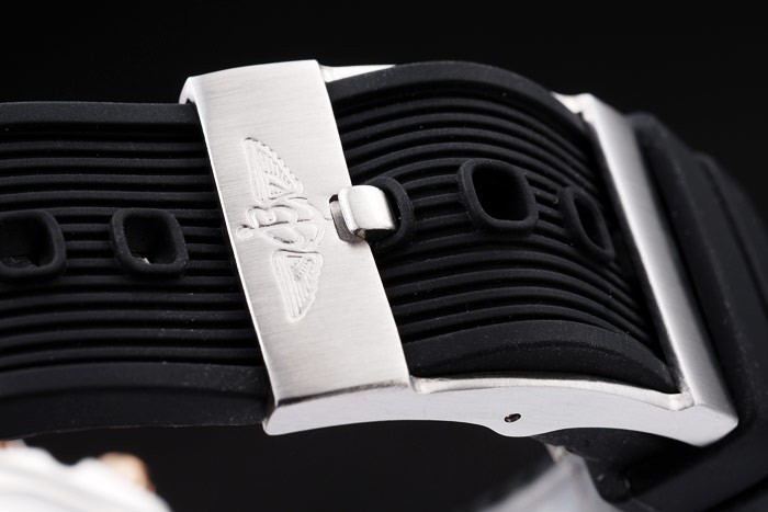 Bracelet: Ribbed black rubber strap with engraved stainless steel hook-buckle clasp with Breitling logo on top