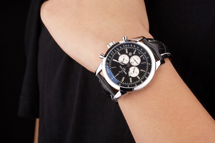 Bracelet: Heat embossed Breitling black crocodile leather strap with white thread stitching and a Breitling logo engraved fold-in stainless steel clasp