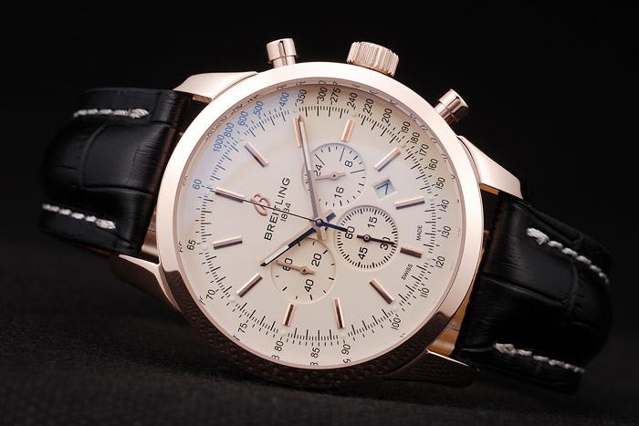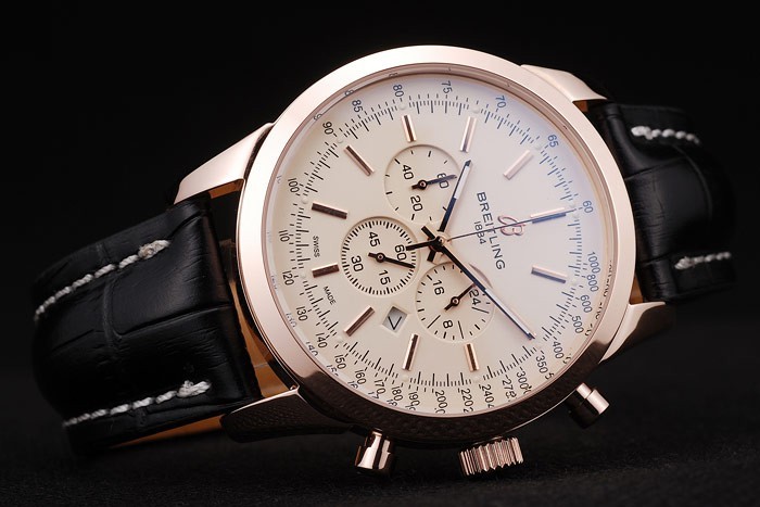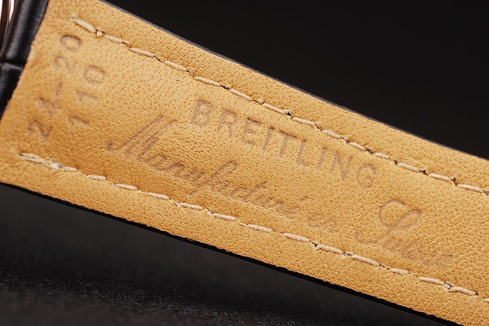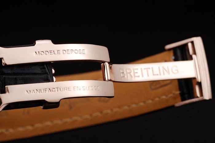 Bracelet: Heat embossed Breitling black crocodile leather strap with white thread stitching and a Breitling logo engraved fold-in rose-gold plated clasp