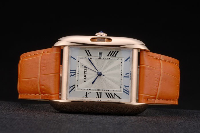 Bracelet: Cartier heat embossed orange crocodile leather strap with 18k rose-gold plated fold-in buckle clasp