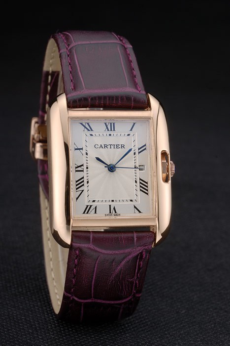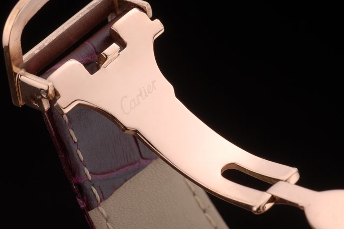 Bracelet: Cartier heat embossed purple crocodile leather strap with 18k rose-gold plated fold-in buckle clasp