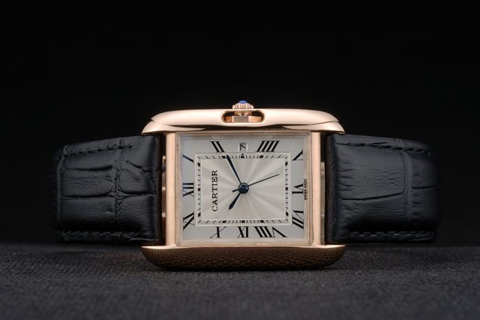 Bracelet: Cartier heat embossed black crocodile leather strap with 18k rose-gold plated fold-in buckle clasp