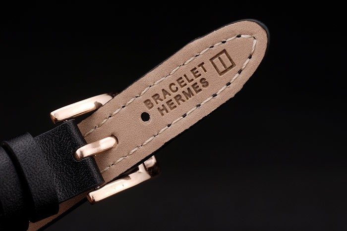 Bracelet: Elongated black leather strap with heat embossed Bracelet Hermes stamp and Hermes engraved rose-gold plated hook-buckle clasp