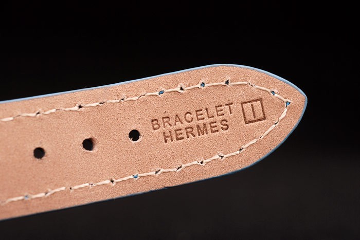 Bracelet: Light blue leather strap with heat embossed Bracelet Hermes stamp and Hermes engraved polished stainless steel hook-buckle clasp