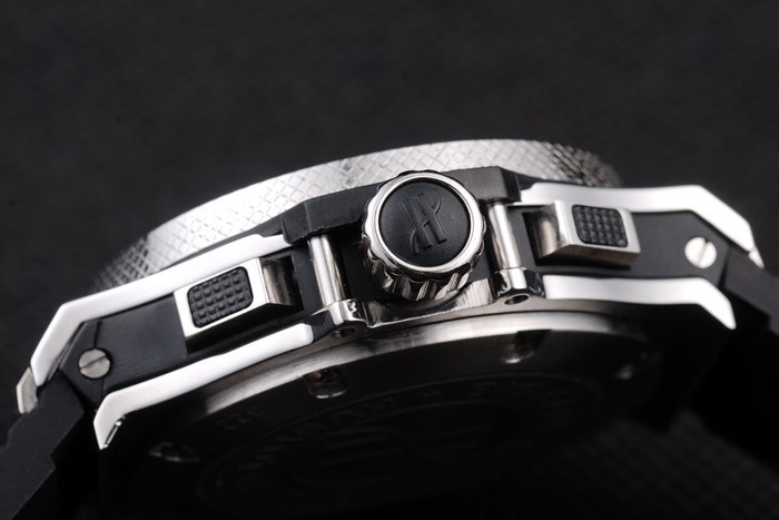 Crown: Cutwork polished stainless steel crown with ‘H’ engraving and two rectangular push-button crowns on either side, all studded with black rubber trimmings