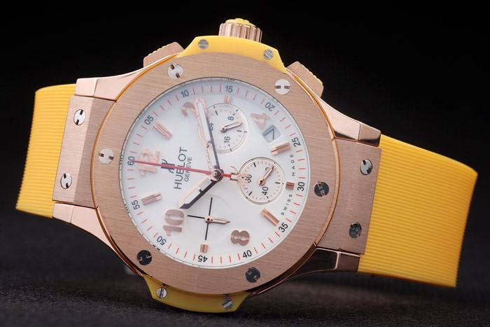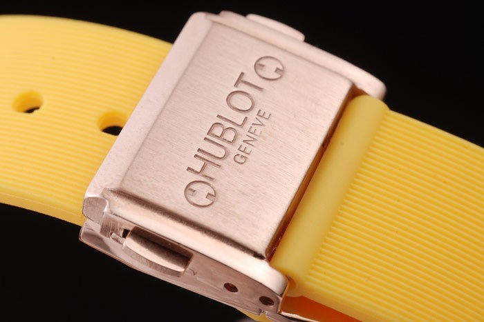 Bracelet: Textured yellow rubber band with rose-gold push-button hook clasp and Hublot engravings