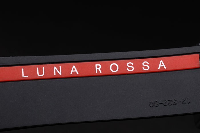 Bracelet: Textured black rubber band with stainless steel push-button hook clasp, heat embossed LUNA ROSSA engraving and Hublot inscriptions