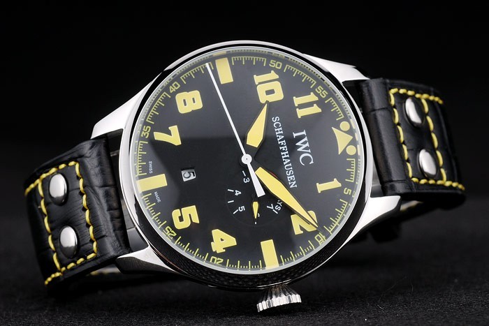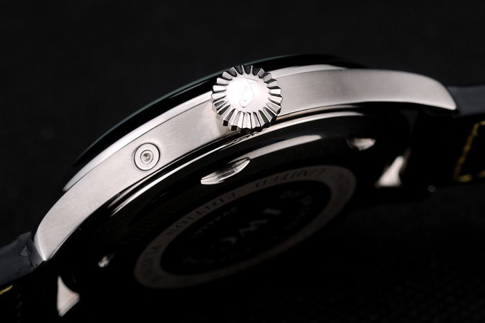 Bracelet: IWC heat embossed black crocodile leather strap with yellow thread stitching and IWC engraved brushed stainless steel hook-buckle clasp
