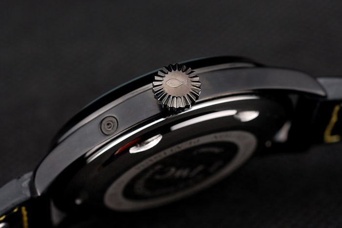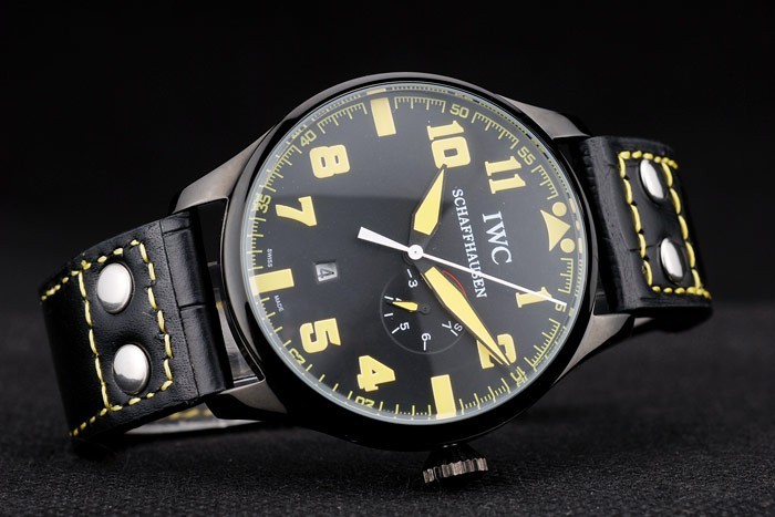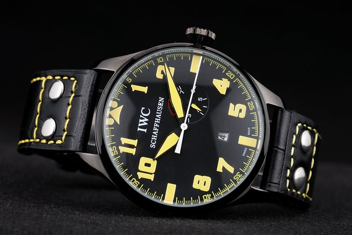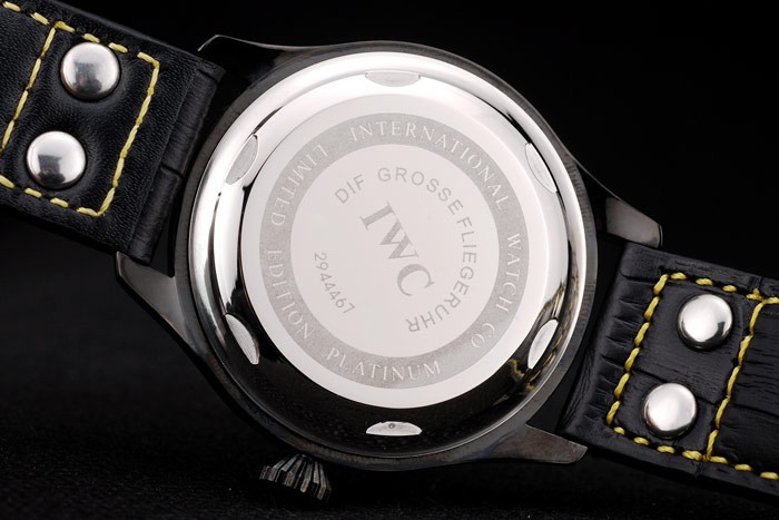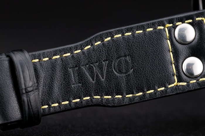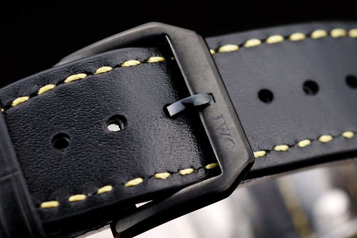 Bracelet: IWC heat embossed black crocodile leather strap with yellow thread stitching and IWC engraved ion-plated stainless steel hook-buckle clasp