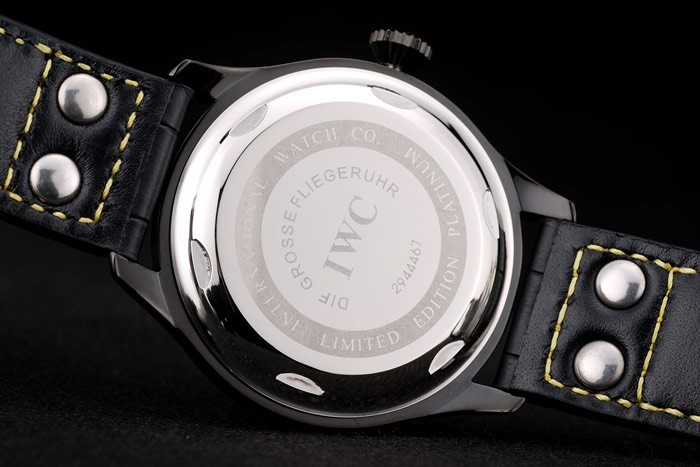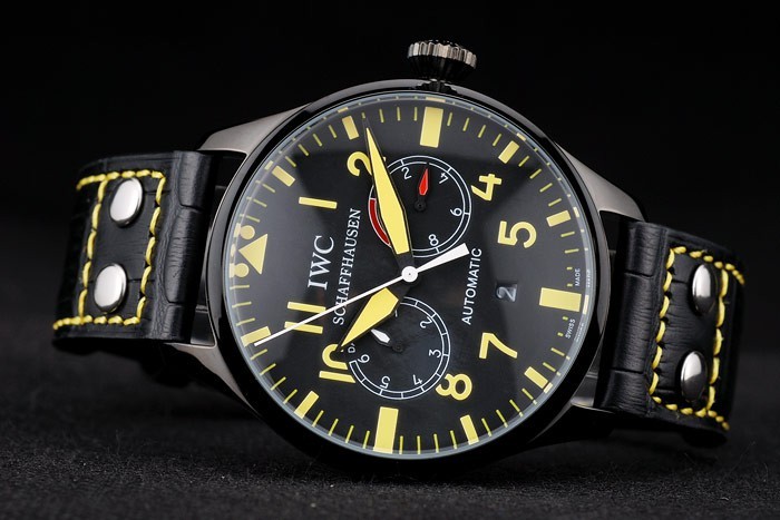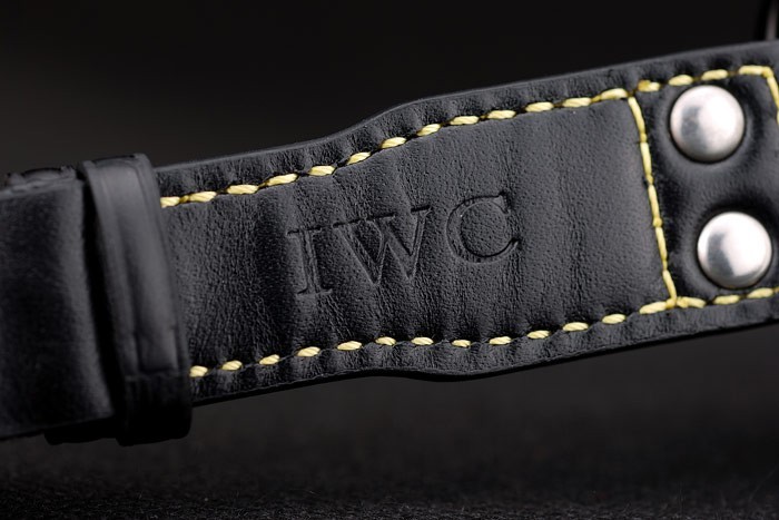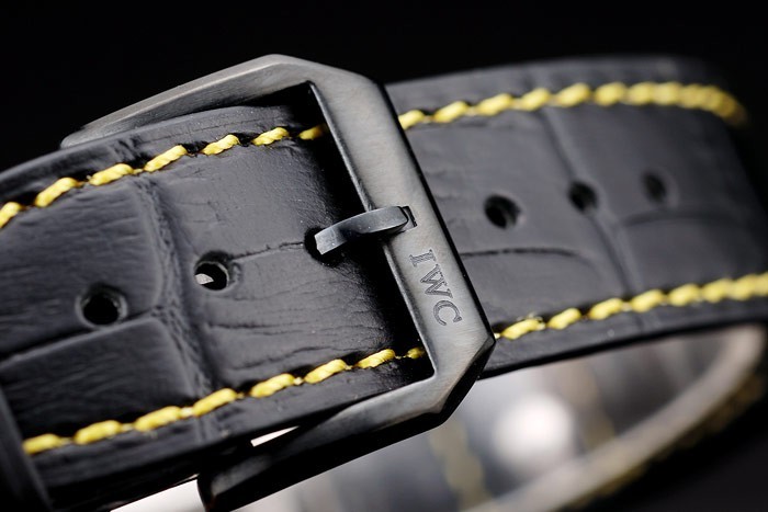 Bracelet: IWC heat embossed black crocodile leather strap with yellow thread stitching and IWC engraved ion-plated stainless steel hook-buckle clasp