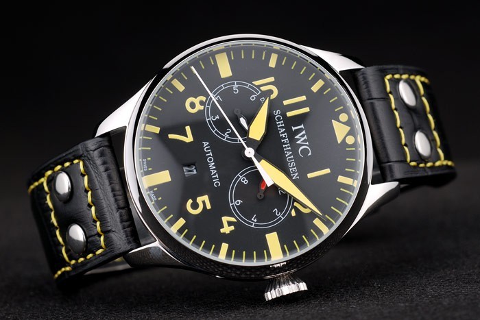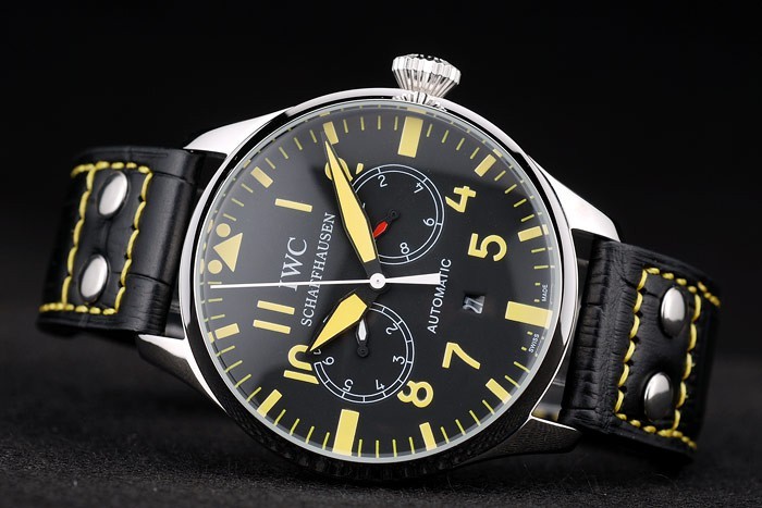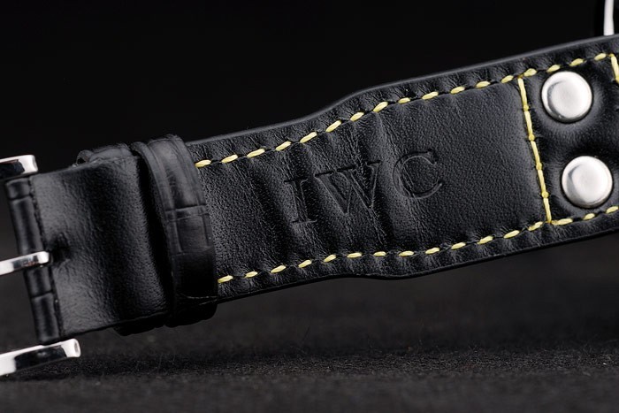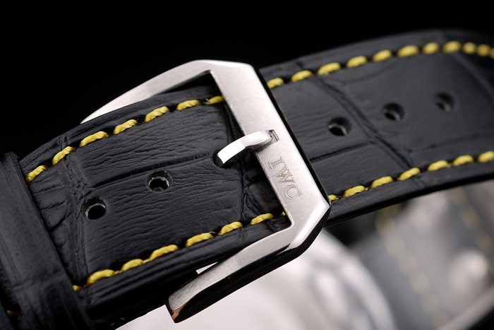 Bracelet: IWC heat embossed black crocodile leather strap with yellow thread stitching and IWC engraved brushed stainless steel hook-buckle clasp