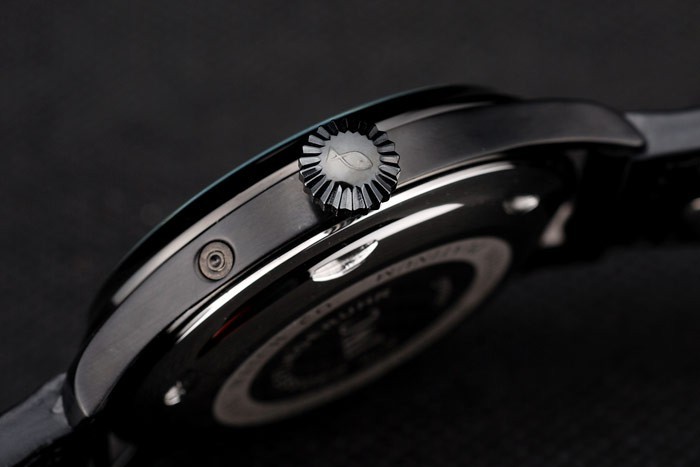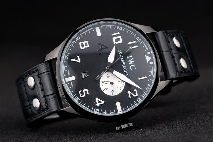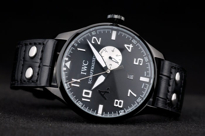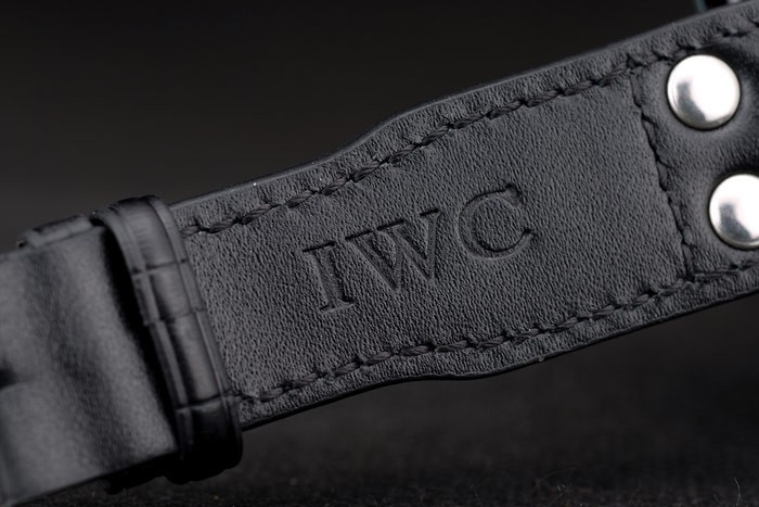 Bracelet: IWC heat embossed black crocodile leather strap with IWC engraved ion-plated stainless steel hook-buckle clasp
