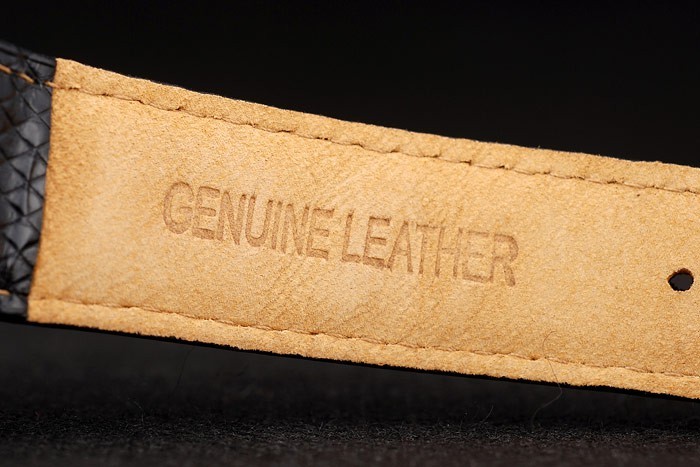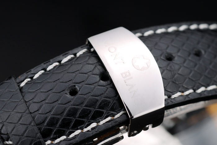 Bracelet: MontBlanc heat embossed black snakeskin leather strap with white thread stitching and polished stainless steel hidden hook clasp