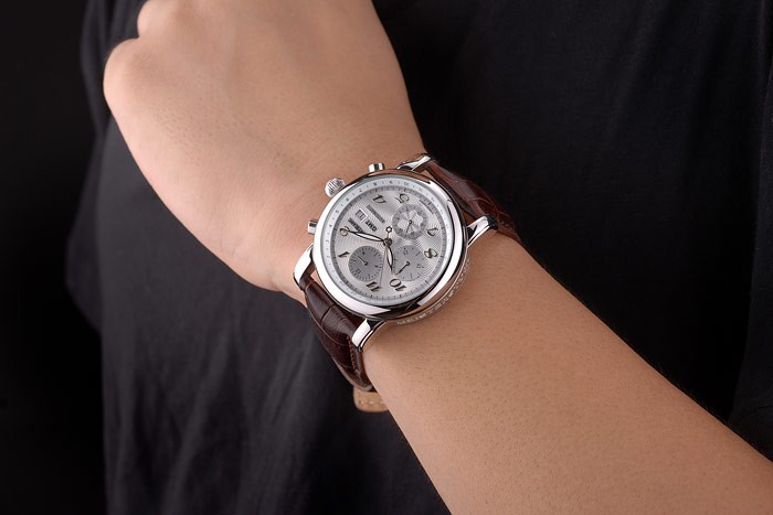 Bracelet: MontBlanc heat embossed brown crocodile leather strap with MontBlanc and logo inscribed polished stainless steel hidden hook clasp