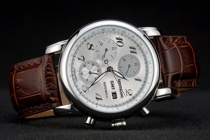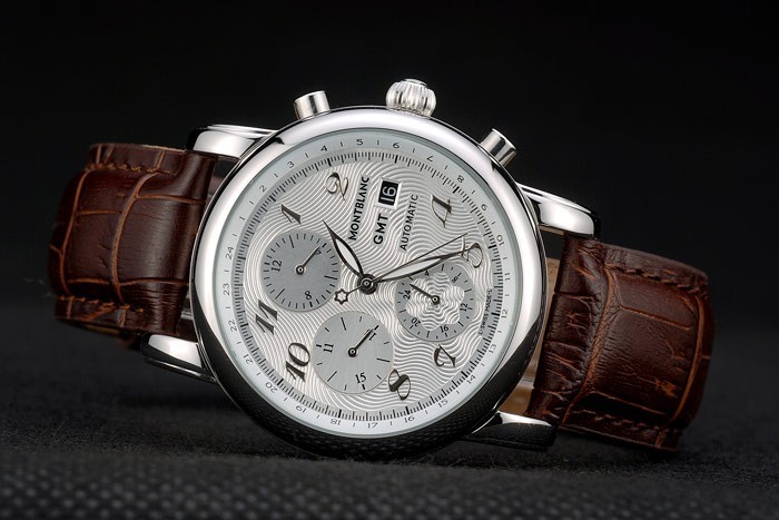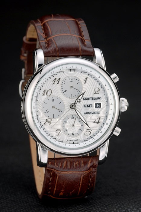 Crown: Polished stainless steel rounded cutwork crown with MontBlanc logo and two polished stainless steel push button crowns on either side of it