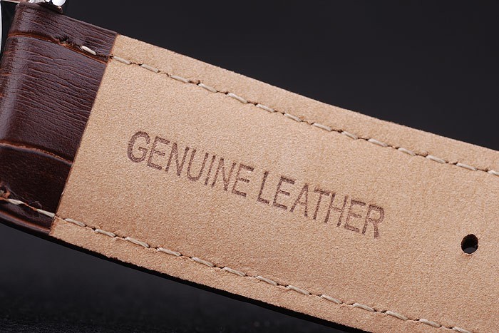 Bracelet: Heat embossed MontBlanc brown crocodile leather strap with MontBlanc name and logo engraved polished stainless steel flip-over hook clasp