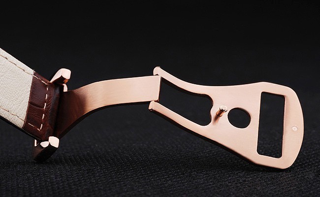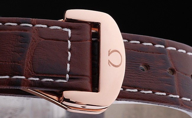 Bracelet: Brown crocodile leather strap with white stitching and Omega logo engraved yellow gold hook-buckle clasp