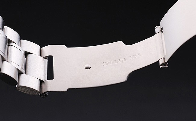 Bracelet: Brushed and polished stainless steel link bracelet with Omega engravings push button release deployment clasp