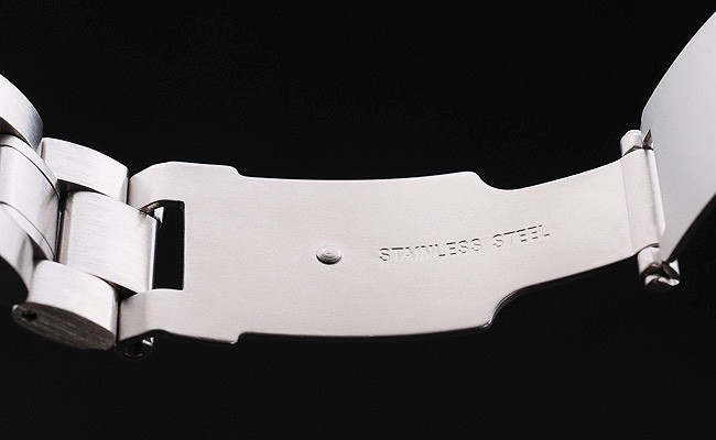 Bracelet: Brushed and polished stainless steel link bracelet with Omega engravings push button release deployment clasp