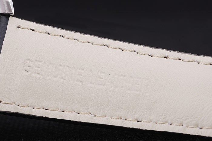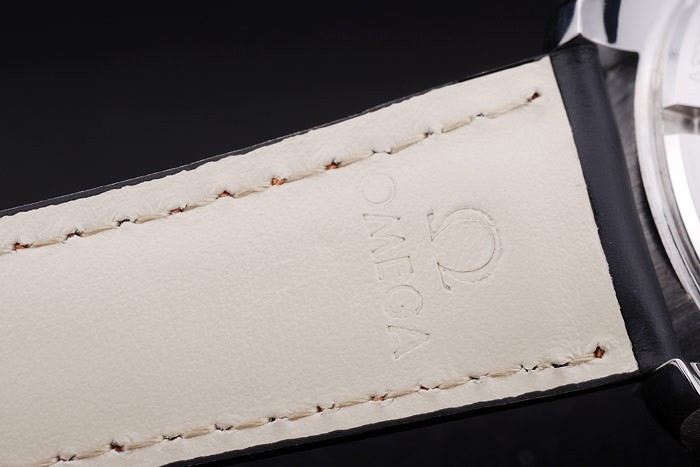 Bracelet: Heat embossed Omega name and logo orange stitching black leather strap with Omega logo engraved polished stainless steel fold-in flip clasp