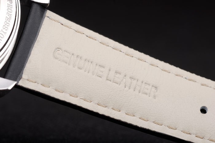 Bracelet: Orange stitched black leather strap with heat embossed Omega stamp and polished stainless steel fold-in clasp with Omega logo on top