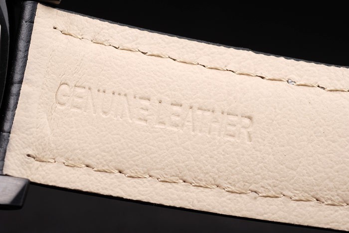 Bracelet: Black crocodile leather strap with white stitching and heat embossed Luminor Panerai stamp and ion-plated stainless steel hook-buckle clasp with Panerai engraving
