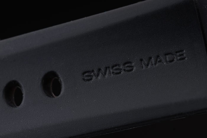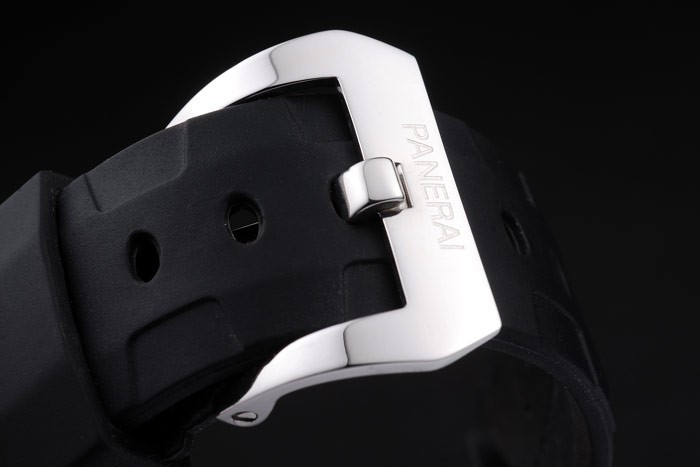 Bracelet: Black rubber strap with heat embossed Officine Panerai strap and brushed stainless steel fold-in hook clasp