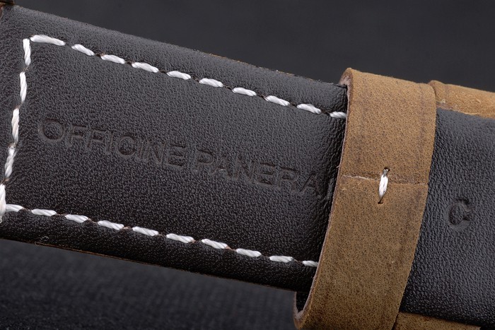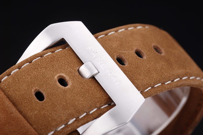 Bracelet: Heat embossed Officine Panerai Italy stamped tan suede leather strap with stainless steel hook-buckle clasp