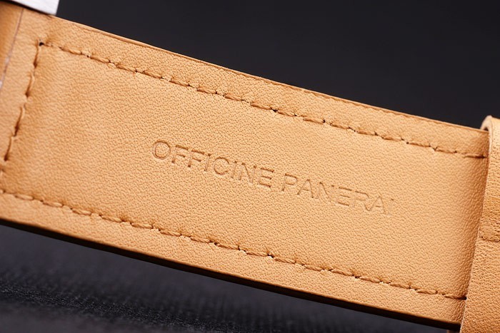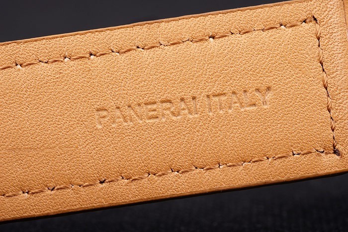 Bracelet: Heat embossed Officine Panerai Italy stamped tan leather strap with stainless steel hook-buckle clasp