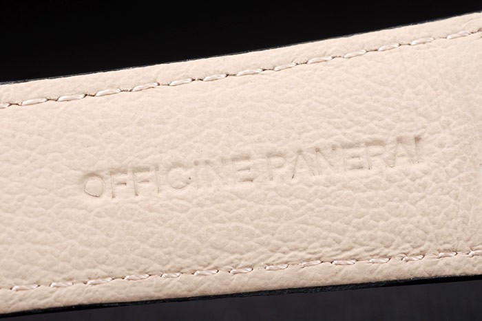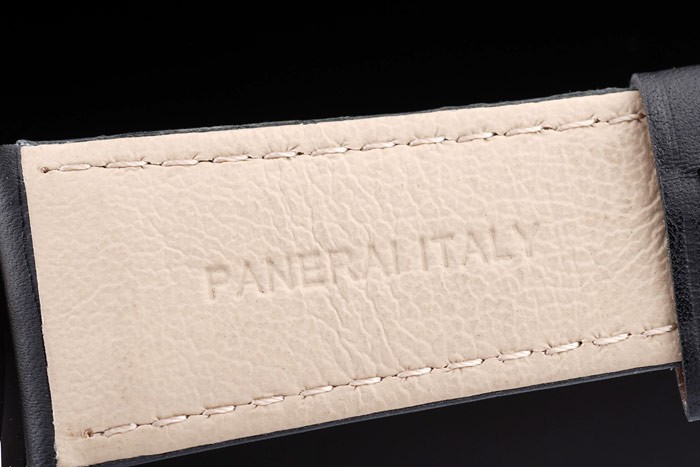 Bracelet: Black leather strap with white stitching and heat embossed Officine Panerai Italy stamp and brushed stainless steel hook-buckle clasp with Panerai engraving