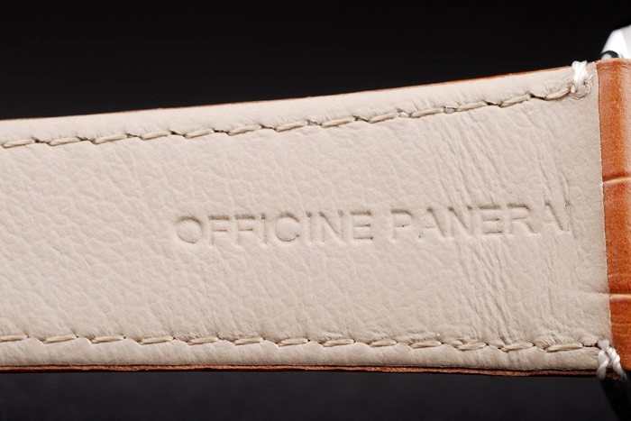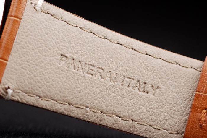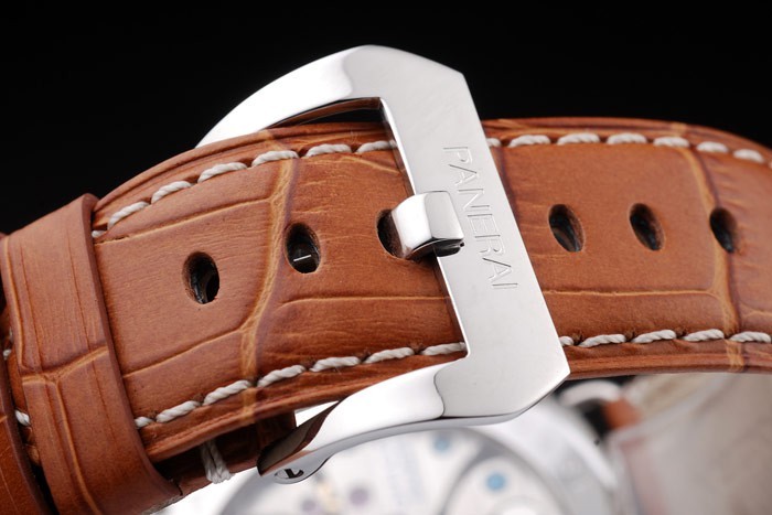 Bracelet: Brown crocodile leather strap with white stitching and heat embossed Officine Panerai Italy stamp and polished stainless steel hook-buckle clasp with Panerai engraving