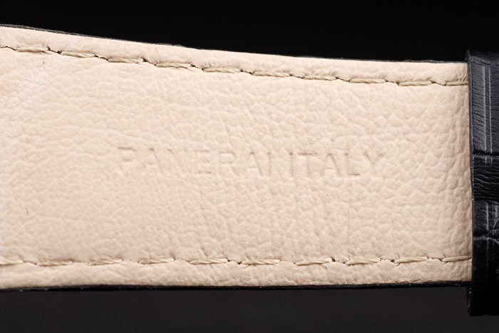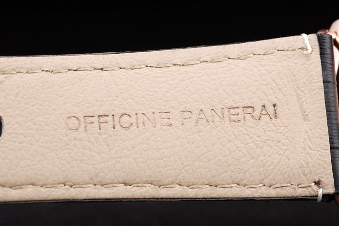 Bracelet: Black crocodile leather strap with white stitching and heat embossed Officine Panerai Italy stamp and 18k rose-gold plated hook-buckle clasp with Panerai engraving