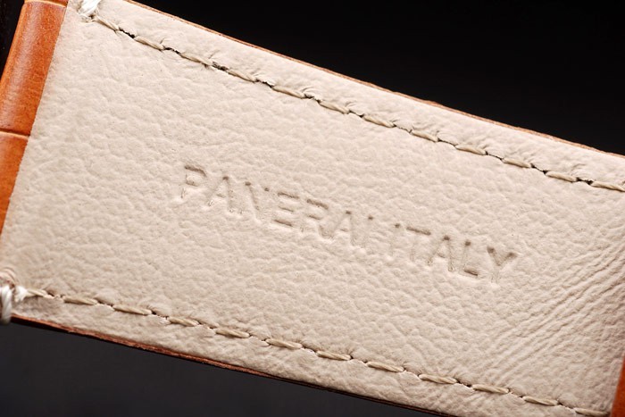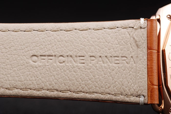 Bracelet: Brown crocodile leather strap with white stitching and heat embossed Officine Panerai Italy stamp and 18k rose-gold plated hook-buckle clasp with Panerai engraving