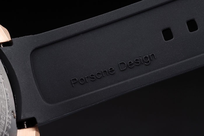 Bracelet: Tyre-groove black rubber strap with heat embossed Porsche stamp and rose-gold hook-buckle clasp with Porsche inscription