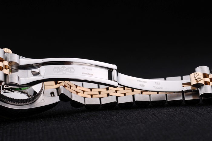 Bracelet: Two toned triple link bracelet in polished stainless steel and 18k yellow gold plated steel with Rolex engraving hidden clasp displaying the Rolex logo