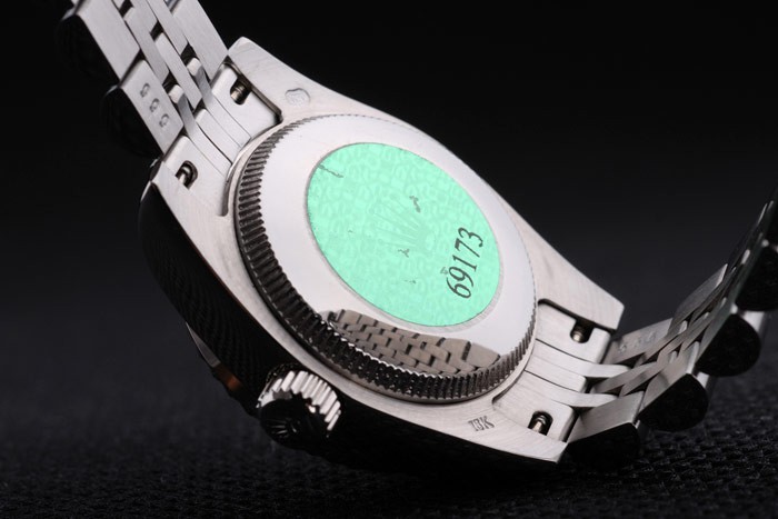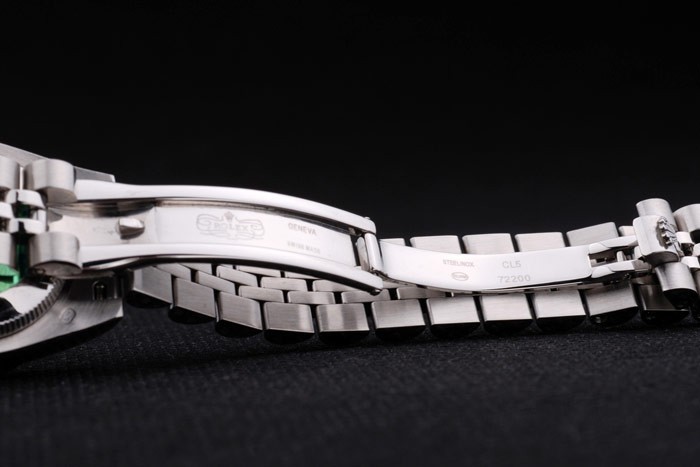 Back: Stainless steel push-in case back with green Rolex logo stamp