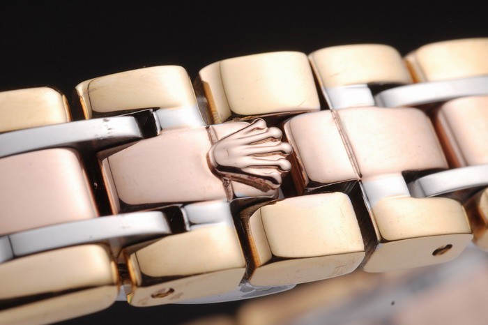 Crown: 18k rose-gold plated steel cutwork crown with Rolex logo